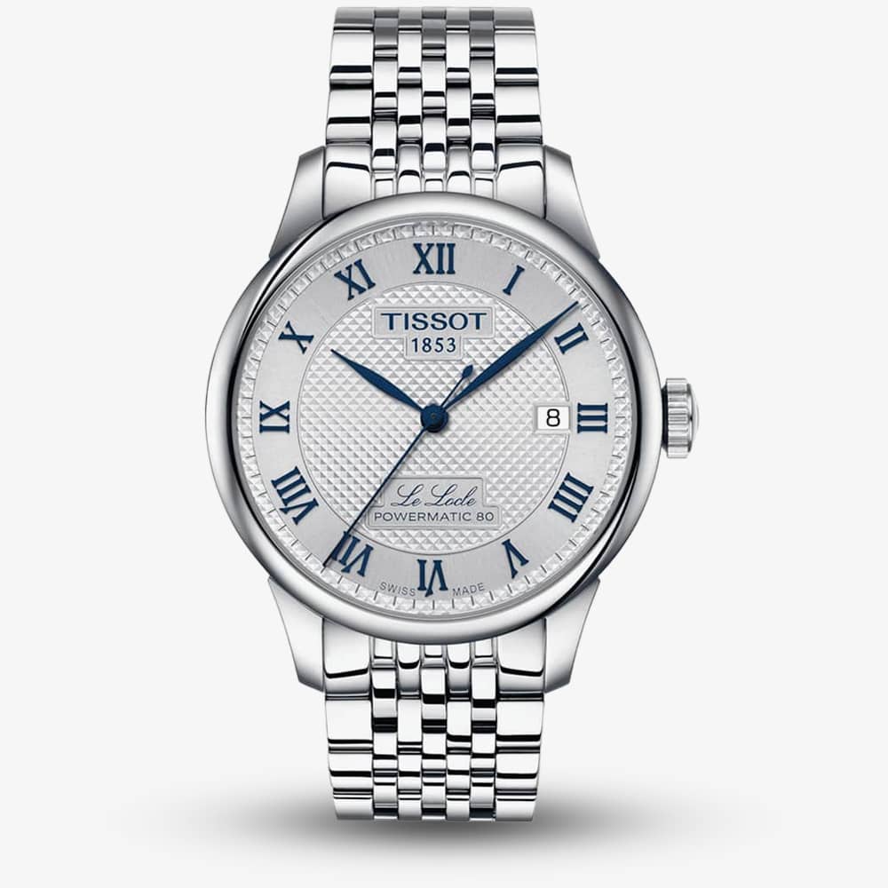 Nestled in the Swiss mountains, Le Locle has been home to Tissot since 1853. In 2003, Tissot celebrated its 150th anniversary with the “Le Locle” collection, inspired by the town’s church clock tower. The Le Locle 20th Edition watch combines tradition and modernity, with a silver dial, blue Roman numerals, and leaf hands, blending classic and contemporary design. This watch includes an extra navy blue leather watch. · Powered by the automatic movement with 23 jewels and a power reserve of up to 80 hours. · Presented on a silver stainless steel bracelet with push button deployment clasp. · Scratch resistant sapphire crystal glass. · 39.3mm case width. · 30 metre water resistance.
