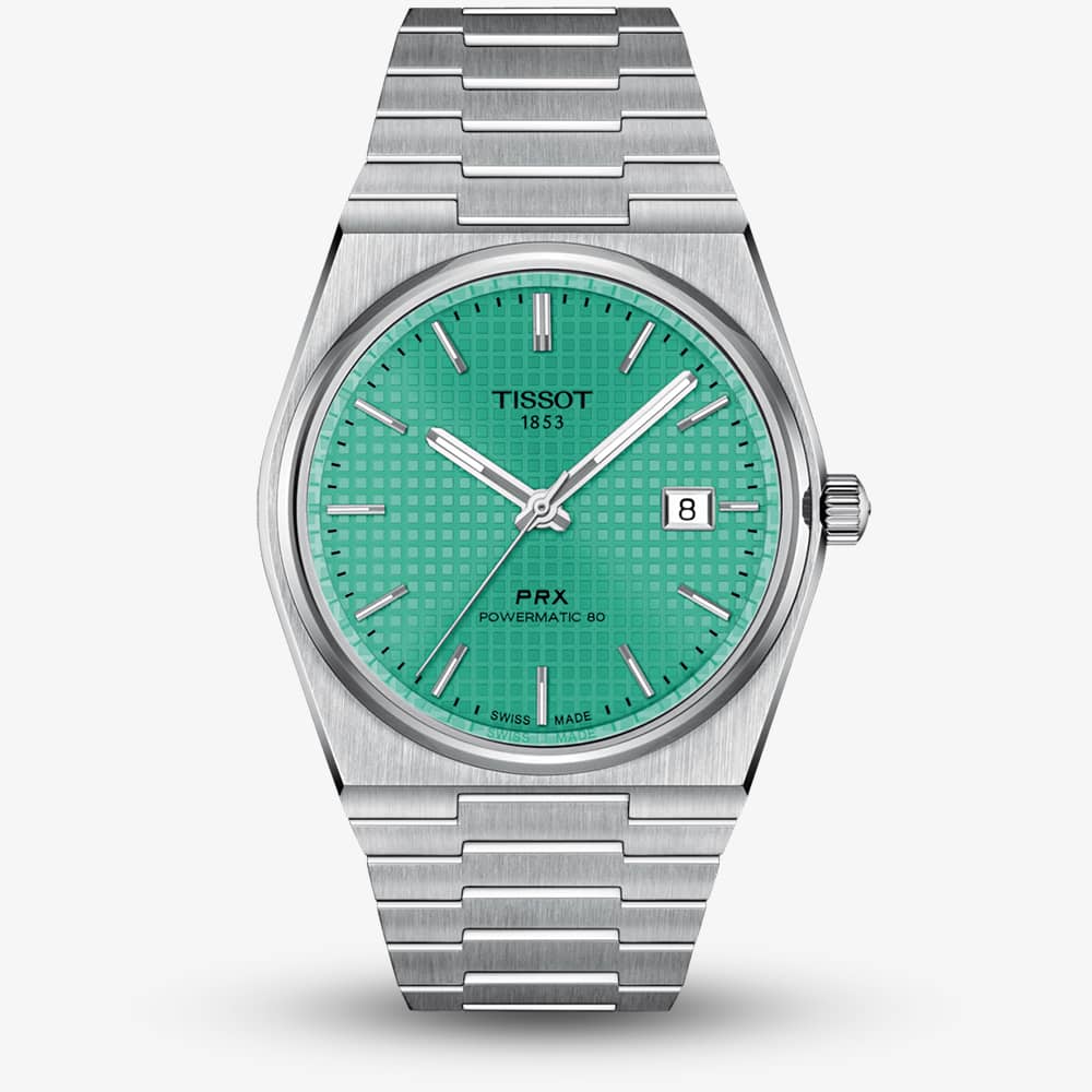 The Tissot PRX Powermatic 80 combines classic styling with modern functionality. This 40mm edition combines a high-quality stainless-steel case with a vibrant mint green grid patterned dial. This vibrant coloured piece comes a 100 metre water resistance, and a Nivachron™ balance hairspring, making it perfect for watch enthusiasts valuing both aesthetics and practicality. The satin finished stainless steel bracelet completes the watch, and fastens using a triple-blade folding steel clasp. · Powered by the automatic movement with a power reserve of up to 80 hours. · Presented on a silver stainless steel bracelet with push button deployment clasp. · Scratch resistant sapphire crystal glass with an anti-reflective coating. · 40mm case width. · 100 metre water resistance.